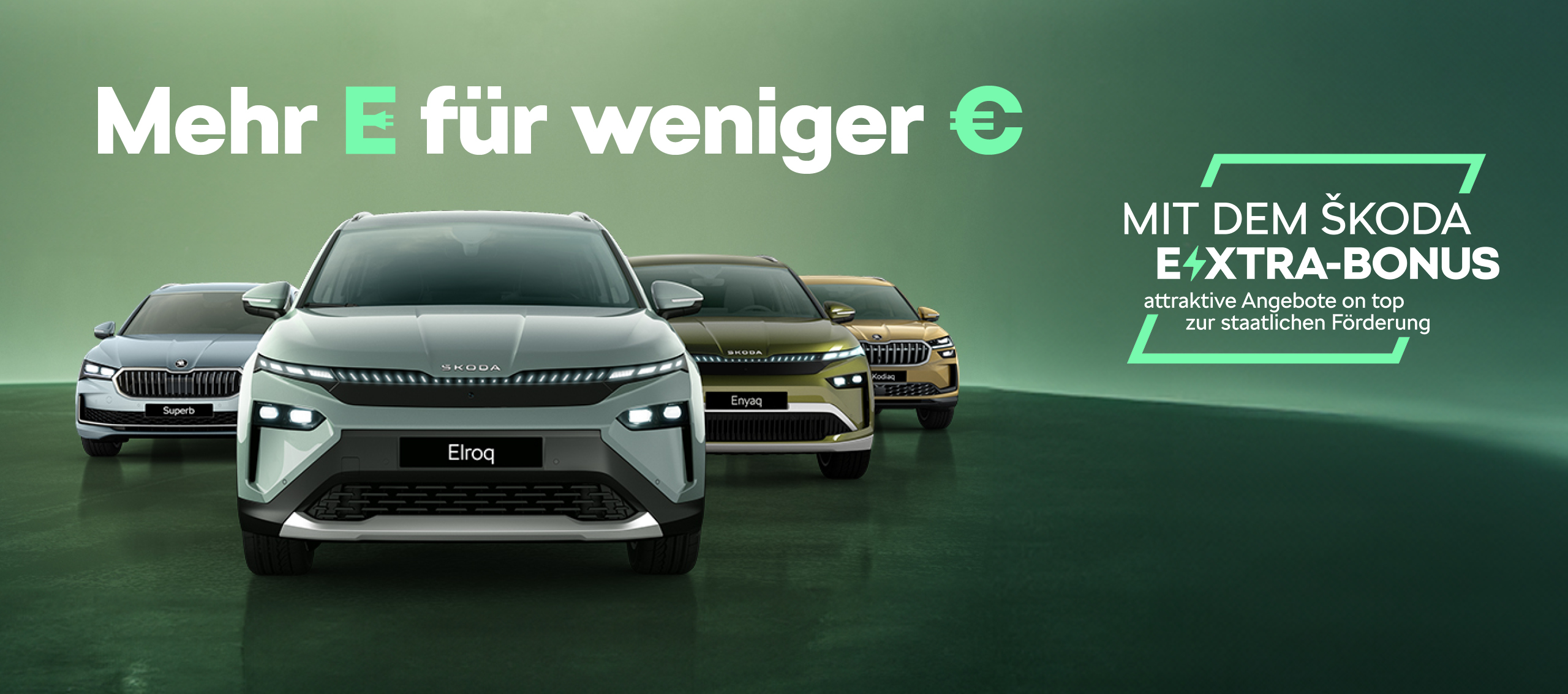 Sie sind bereit für mehr Energie in Ihrem Alltag? Gute Nachrichten: E-Mobilität lohnt sich ab sofort extra! Mit dem Škoda E-XTRA-Bonus1 erhalten Sie bei Ihrem teilnehmenden Škoda Partner attraktive Bonus-Angebote bei Kauf, Finanzierung oder Leasing Ihres elektrifizierten Škoda Wunschmodells.